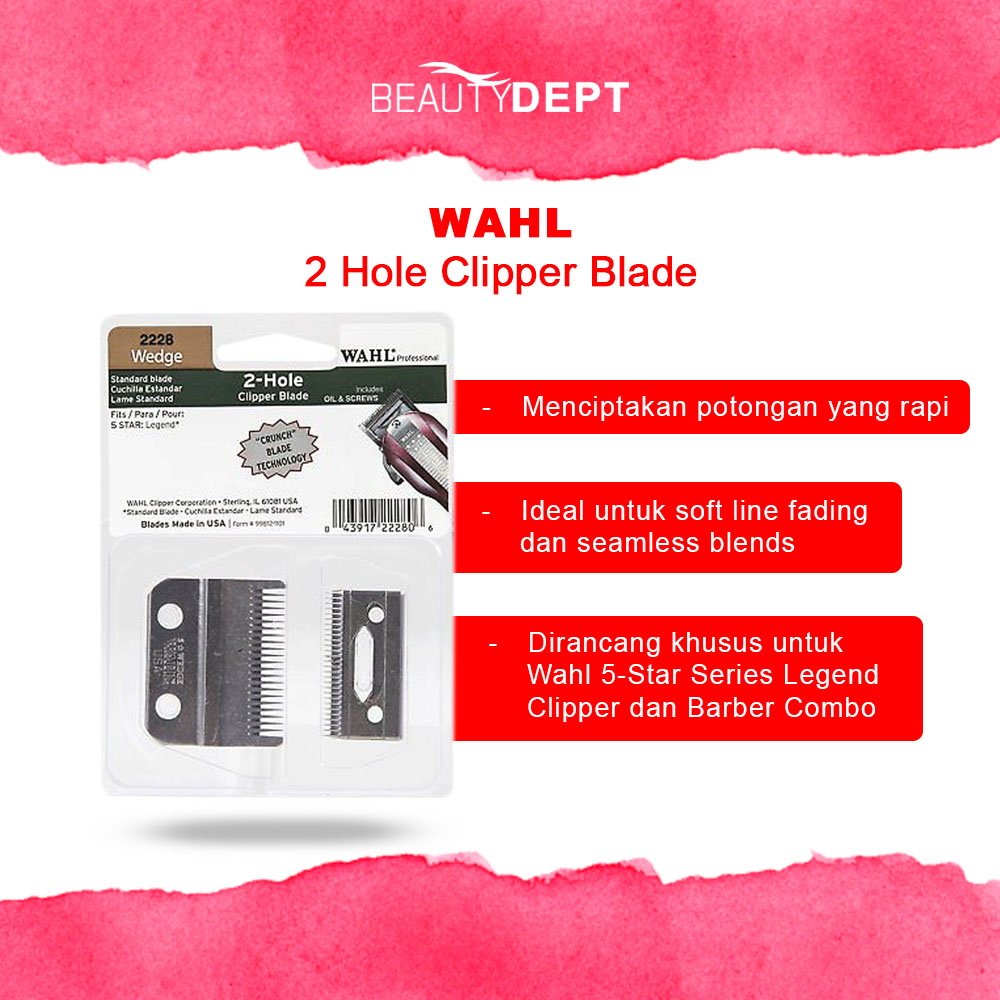 Dibuat khusus bagi pengunaan profesional, alat ini dirancang dalam memberi tampilan yang tajam. Wedge 2 Hole Standard Clipper Blade memiliki fitur teknologi pisau crunch guna menciptakan potongan yang rapi, dengan cara memasangkannya pada Wahl Professional 5 Star Series Legend Clipper. Gigi yang dalam dan tuas pisau yang diperpanjang sangat ideal untuk soft line fading dan seamless blends.